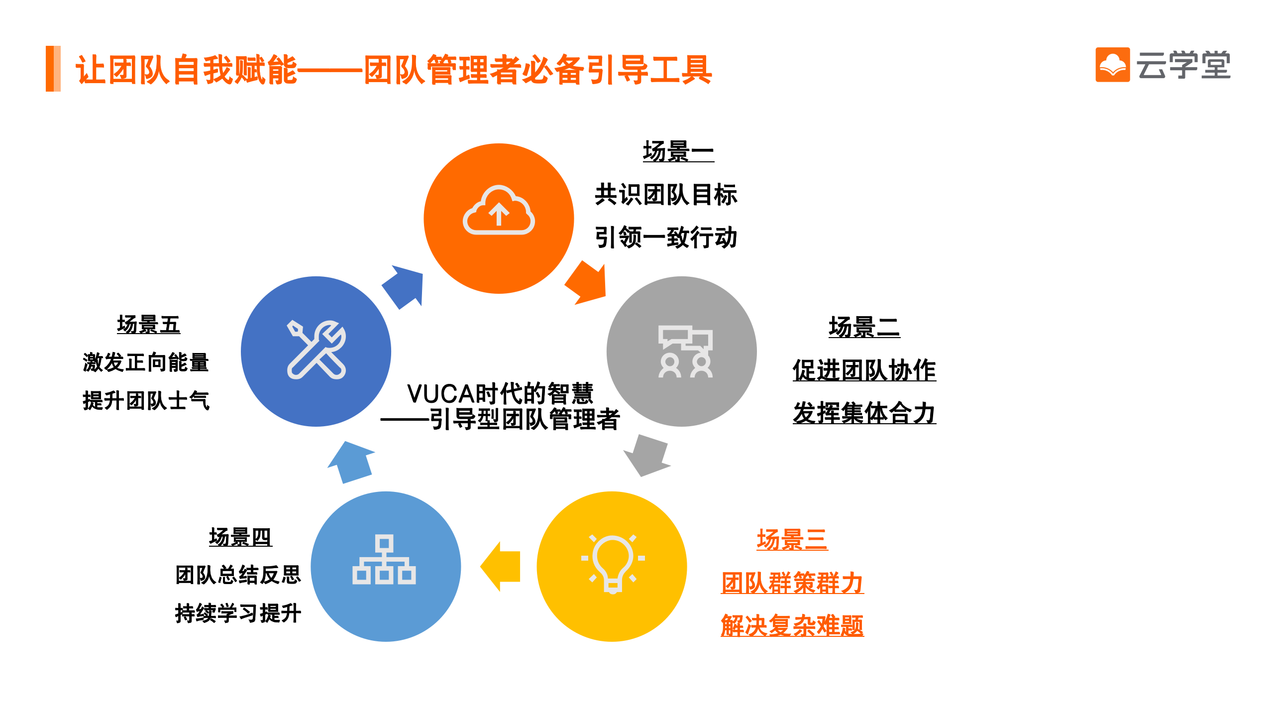 引导创新,破除业务难题的法门 云学堂首席引导师 清华MBA 国际引导者协会(IAF) 认证专业引导师(CPF) 国际行动学习协会(WIAL) 认证行动学习教练(CALC) 前华夏幸福基业培训总监 前北大纵横管理咨询公司资深顾问 「五大典型场景」五个最常见的团队管理场景,引导技术在不同场景的应用方式 「十二个引导工具」适用于不同场景的典型引导工具,易学、易用、易见效 「丰富的案例与练习」与工具紧密结合的案例与练习,拿来就用,一学就会