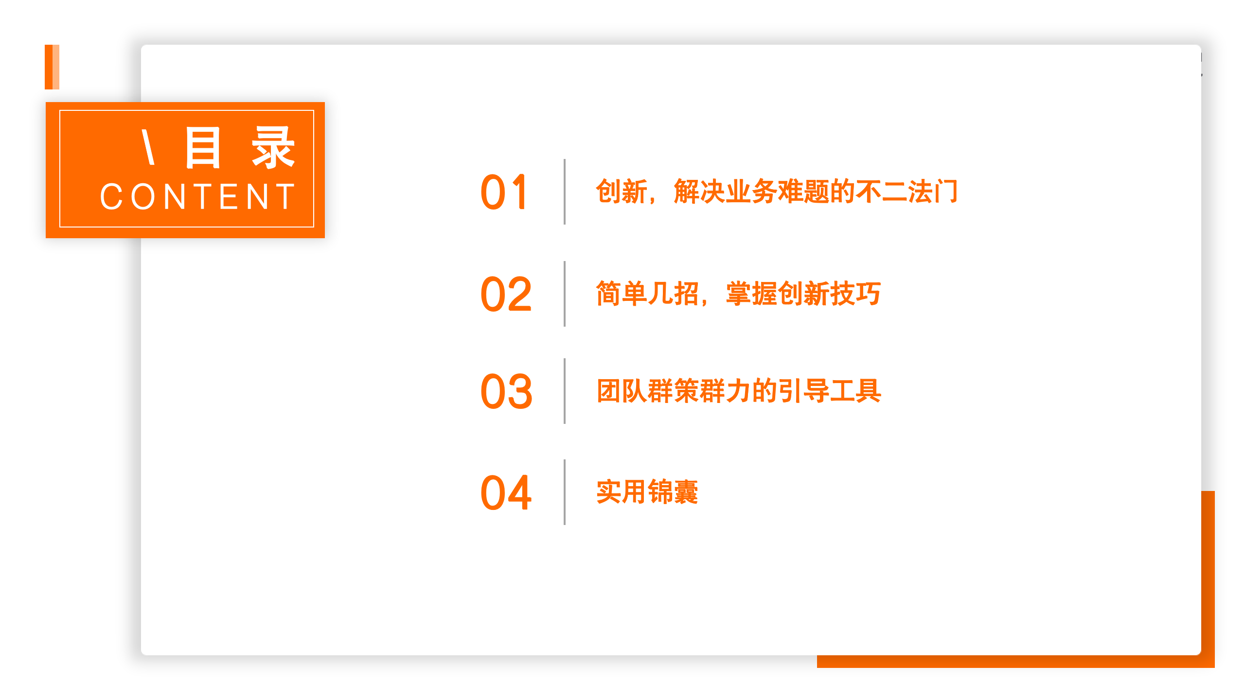 1、突破业务难题,创新是不二法门 2、创新的Why、What、How 3、解决难题的两大工具