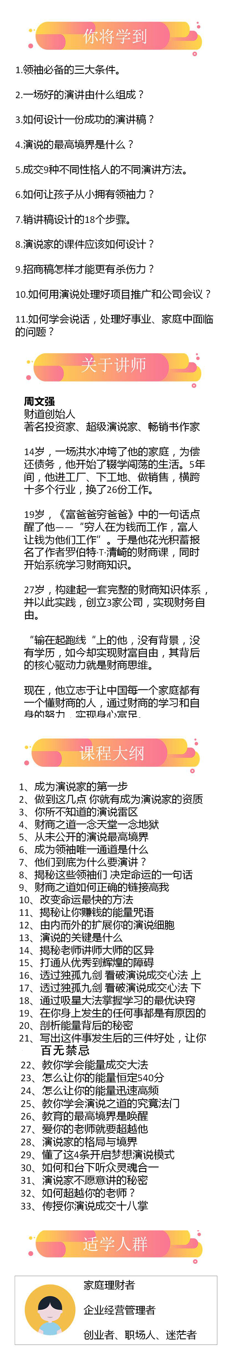 学习本课程可以掌握演说家的课件应该如何设计、如何用演说处理好项目推广和公司会议、如何学会说话,处理好事业、家庭中面临的问题等问题。