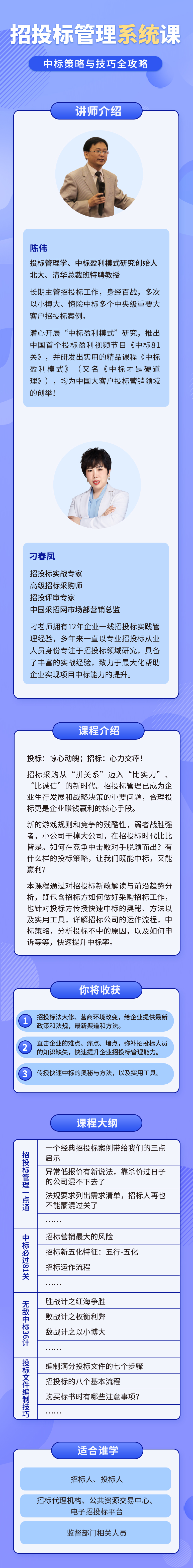 投标:惊心动魄;招标:心力交瘁! 招标采购从“拼关系”迈入“比实力”、“比诚信”的新时代。招投标管理已成为企业生存发展和战略决策的重要问题,合理投标更是企业赚钱赢利的核心手段。 新的游戏规则和竞争的残酷性,弱者战胜强者,小公司干掉大公司,在招投标时代比比皆是。如何在竞争中击败对手脱颖而出?有什么样的投标策略,让我们既能中标,又能赢利? 本课程通过对招投标新政解读与前沿趋势分析,既包含招标方如何做好采购招标工作,也针对投标方传授快速中标的奥秘、方法以及实用工具,详解招标公司的运作流程,中标策略,分析投标不中的原因,以及如何申诉等等,快速提升中标率。
