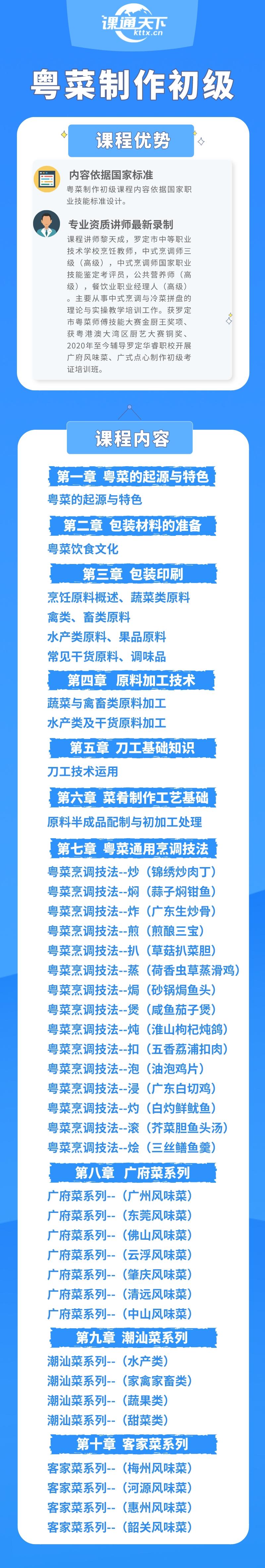 主要学习内容为:粤菜制作(初级)课程参考粤菜烹调初级工标准,结合岗位工作实际,从强化培养操作技能,掌握一门实用技术的角度出发,让学员掌握粤菜基础知识、烹饪原料知识、原料加工技术、原料切配加工技术、粤菜通用烹调技法、广府风味菜、潮式风味菜、客家风味菜等粤菜师傅所应具备的基本专业知识和基本技能,除理论知识外,我们配置了直观明了的实操知识学习。