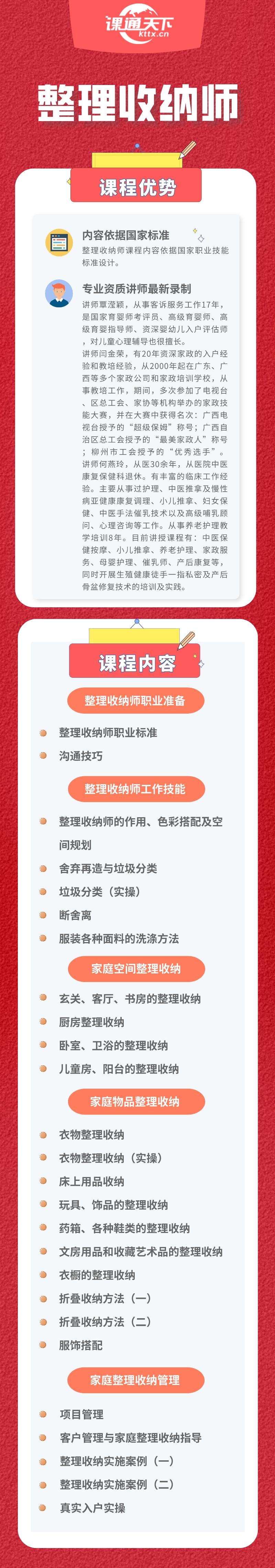 重点难点:课程内容重点是家庭空间整理收纳和家庭物品整理收纳。