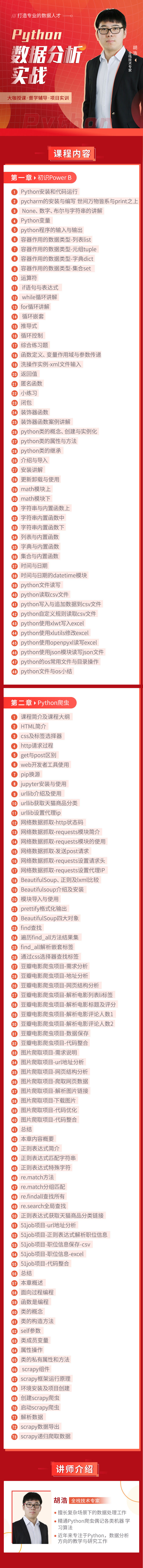 Python数据分析。将主要侧重Python语言及数据分析包的学习。通过对Python语言、Python数据处理、分析包及可视化包的学习,训练学员掌握必备的基本编码能力,为后续更高级的内容打下坚实且必要基础。
