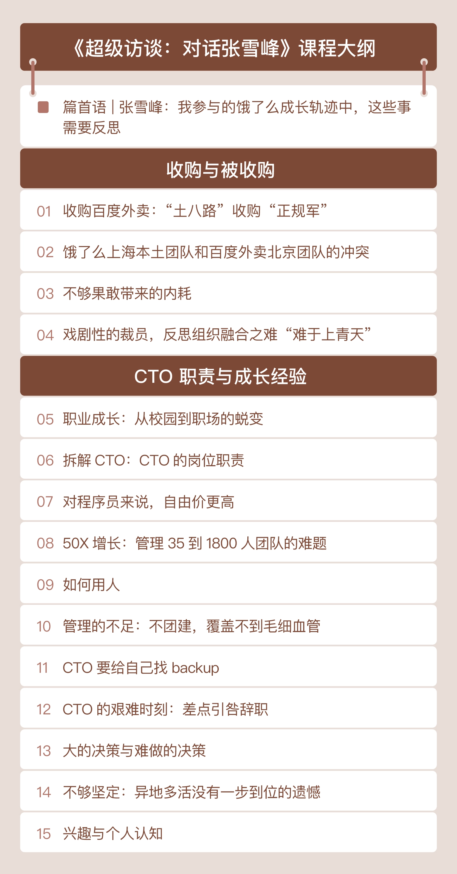 饿了么收购百度外卖背后有哪些故事?为什么说组织融合最大的挑战是文化融合?团队 50X 增长,CTO 如何解决面临的各种难题?从程序员到 CTO 有哪些“打怪升级”的过程?CTO 的本职工作包含几个层面?CTO 如何抽象技术团队的价值……如果你对这些问题感兴趣的话,可以从本专栏找到答案。