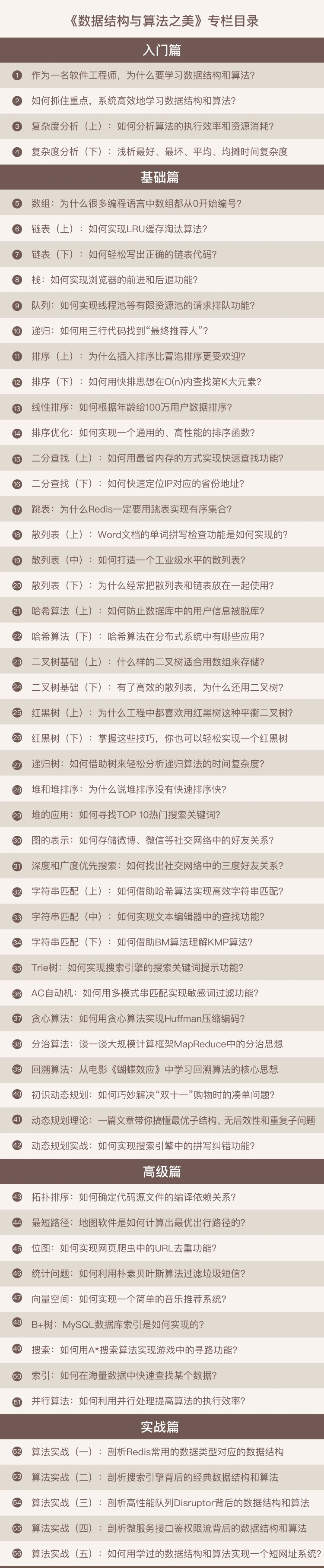 将通过实战案例串讲前面讲到的数据结构和算法;并拿一些开源项目和框架,剖析它们背后的数据结构和算法;并带你用学过的内容实现一个短网址系统;深化对概念和应用的理解,灵活使用数据结构和算法。