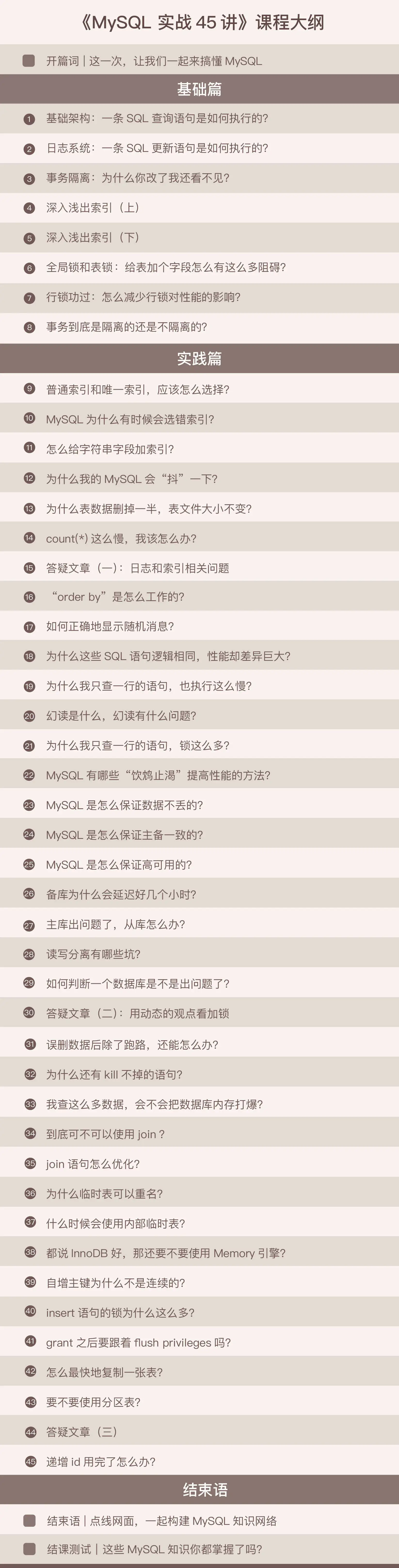 本专栏一共 45 讲,全集更新完毕,通过探讨 MySQL 实战中最常见的 36 个 痛点问题,串起各个零散的知识点,配合 100+ 手绘详解图,由线到面带你构建 MySQL 系统的学习路径。