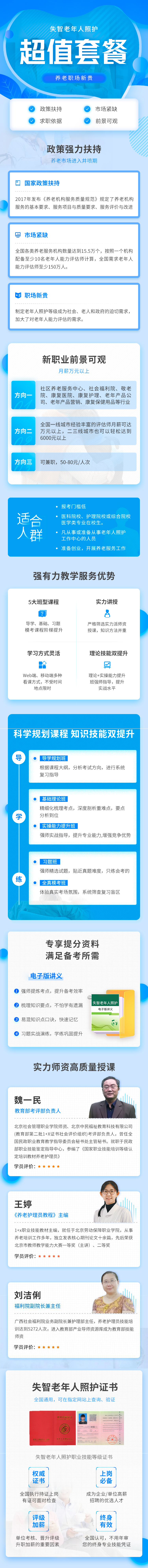 通过失智老年人照护理论基础课程和实操能力课程的学习,学员可以学到失智老年人照护的基本理论知识,掌握失智老年人照护职业能力所要求的实操作技能,通过失智老年人照护职业技能考核,取得专业职业技能等级证书,最终胜任失智老年人居家、社区及机构照护岗位。