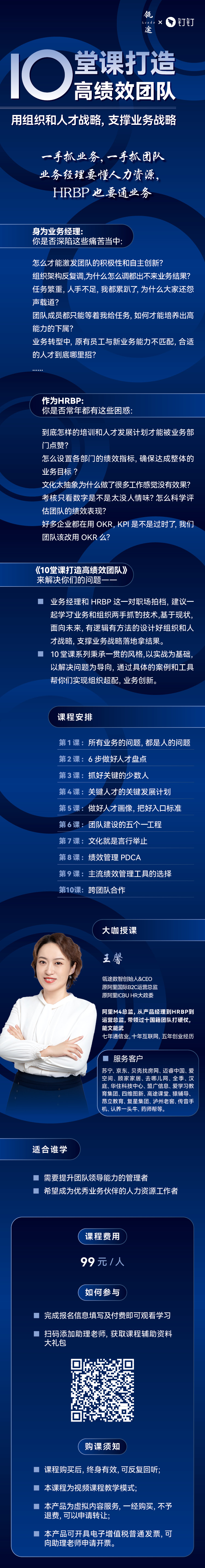 业务经理和HRBP这一对职场拍档,建议一起学习“业务和组织两手抓”的技术,基于现状,面向未来,有逻辑有方法的设计好组织和人才战略,支撑业务战略落地拿结果。10堂课系列秉承一贯的风格,以实战为基础,以解决问题为导向,通过具体的案例和工具帮你们实现组织超配,业务创新。 课程对象: 需要提升团队领导能力的管理者 希望成为优秀业务伙伴的人力资源工作者
