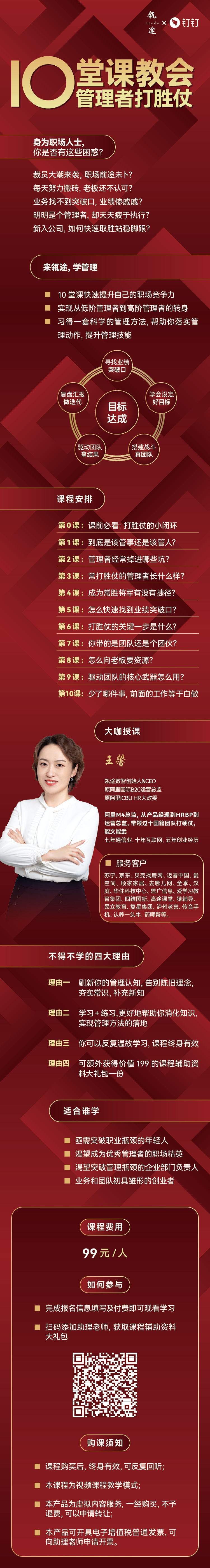 身为职场人士,你是否有这些困惑? 裁员大潮来袭,职场前途未卜? 每天努力搬砖,老板还不认可? 业务找不到突破口,业绩惨戚戚? 明明是个管理者,却天天疲于执行? 新入公司,如何快速取得胜利站稳脚跟? 10堂课快速提升自己的职场竞争力 实现从低阶管理者到高阶管理者的转身 习得一套科学的管理方法,帮助你落实管理动作,提升管理技能 授课对象: 亟需突破职业瓶颈的年轻人 渴望成为优秀管理者的职场精英 渴望突破管理瓶颈的企业部门负责人 业务和团队初具雏形的创业者