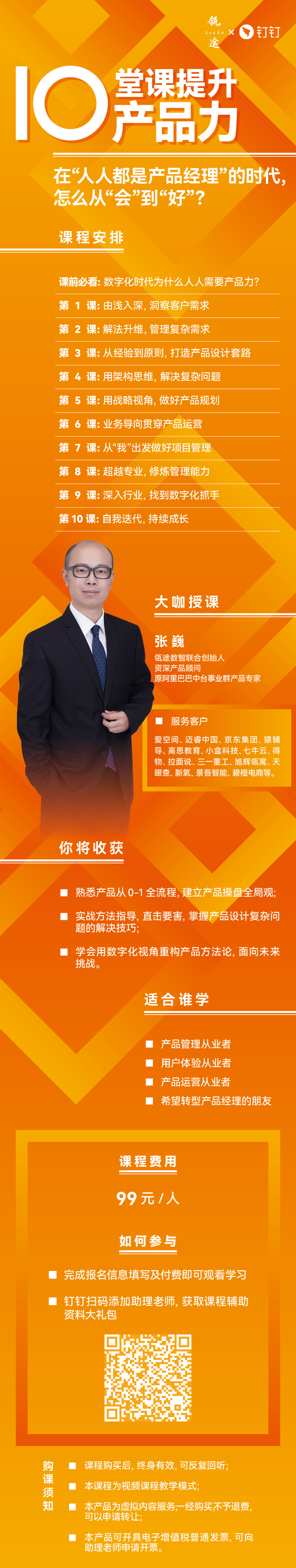 实战总结直击痛点,课程短小精炼,学会用户调研、产品设计等基本方法论; 聚焦落地,每一课都有实操指导,掌握从调研到产品落地全流程; 以数字化视角重构互联网产品方法论,面向未来挑战。 授课对象: 3-5年经验的产品经理 即将转身管理的产品经理 传统行业自学产品的朋友 希望转型产品经理的朋友