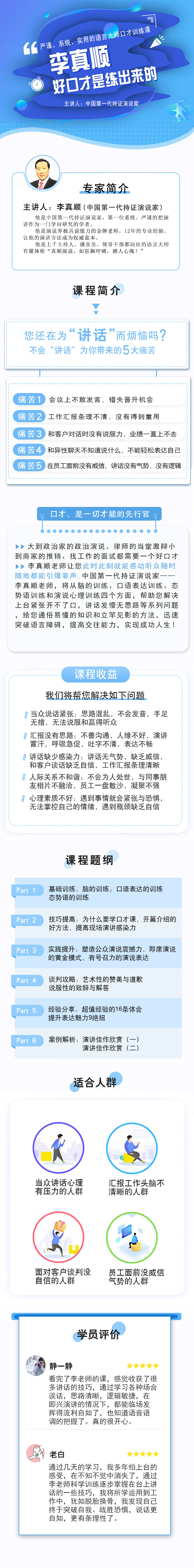《李真顺:好口才是练出来的》课程,将从脑的训练、口语表达训练、态势语训练和演说心理训练四个方面,帮助您解决上台紧张开不了口,讲话发懵无思路等一系列问题,给您通俗易懂的知识和立竿见影的方法,迅速突破语言障碍,提高交往能力,实现成功人生!