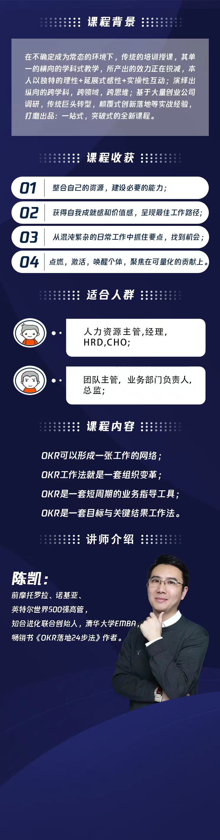 几乎所有的互联网大佬,新品牌创业者,独角兽们,都在谈产品思维,用户体验,组织发展,个体价值之间找寻平衡;无数的管理科学与模型侵蚀着经营者的思维;那么多管理者都在强调的“组织效能”,到底是什么?其实OKR工作法就是一套组织变革。它能训练你和你的团队,从混沌繁杂的日常工作中抓住要点,找到机会;整合自己的资源,建设必要的能力;点燃,激活,唤醒个体,聚焦在可量化的贡献上;获得自我成就感和价值感,呈现最佳工作路径。