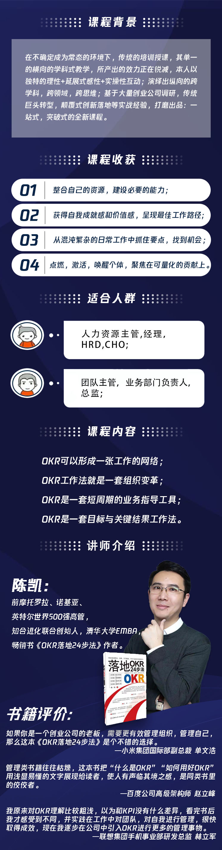 几乎所有的互联网大佬,新品牌创业者,独角兽们,都在谈产品思维,用户体验,组织发展,个体价值之间找寻平衡;无数的管理科学与模型侵蚀着经营者的思维;那么多管理者都在强调的“组织效能”,到底是什么?其实OKR工作法就是一套组织变革。它能训练你和你的团队,从混沌繁杂的日常工作中抓住要点,找到机会;整合自己的资源,建设必要的能力;点燃,激活,唤醒个体,聚焦在可量化的贡献上;获得自我成就感和价值感,呈现最佳工作路径。
