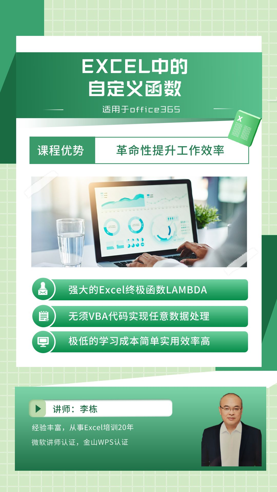 本课程内容适用于Office 365。 本课程是围绕使用Excel终极函数:LAMBDA函数来创建自定义函数展开的。 自定义函数极大的扩展了普通用户的数据处理能力。 传统上,需要使用VBA自定义函数,对普通用户来说难度极高,需要很高的学习成本。在Office 365中,微软推出了LAMBDA函数,利用LAMBDA函数,用户可以自定义函数,实现任意的数据处理逻辑,却不需要编写任何代码,只是使用Excel函数即可。 同时,微软还推出了一批LAMBDA函数的“伴侣”函数,如MAP,REDUCE,SCAN,BYROW,BYCOL,MAKEARRAY等,方便处理设计数据区域循环的问题。