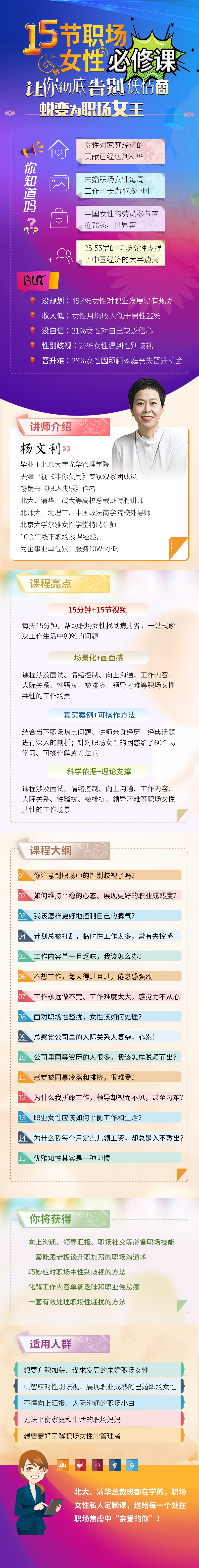 你知道吗? 女性对家庭经济的贡献已经达到35% 未婚职场女性每周工作时长为47.6小时 中国女性的劳动参与率近70%,世界第一 25-55岁的职场女性支撑了中国经济的大半边天 But 没规划:45.4%女性对职业发展没有规划 收入低:女性月均收入低于男性22% 没自信:21%女性对自己缺乏信心 性别歧视:25%女性遇到性别歧视 晋升难:28%女性因照顾家庭丧失晋升机会