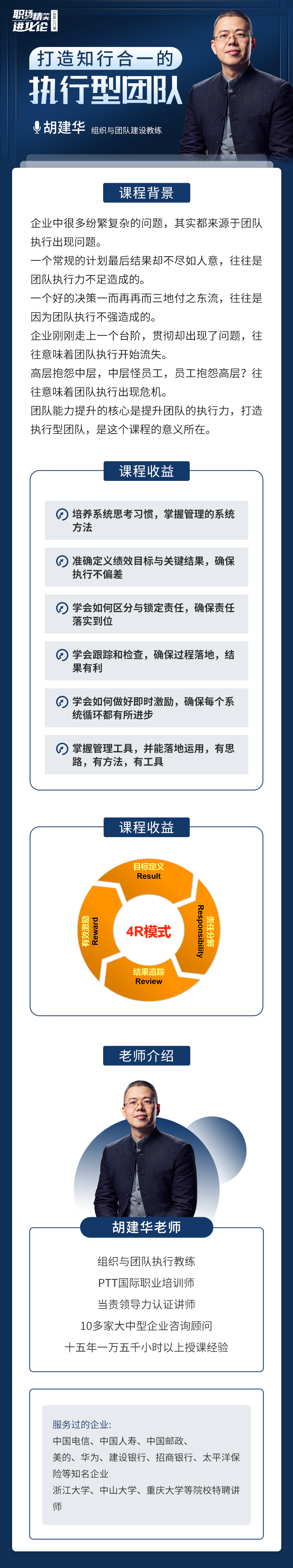 企业中很多纷繁复杂的问题,其实都来源于团队执行出现问题。 一个常规的计划最后结果却不尽如人意,往往是团队执行力不足造成的。 一个好的决策一而再再而三地付之东流,往往是因为团队执行不强造成的。 企业刚刚走上一个台阶,贯彻却出现了问题,往往意味着团队执行开始流失。 高层抱怨中层,中层怪员工,员工抱怨高层?往往意味着团队执行出现危机。 团队能力提升的核心是提升团队的执行力,打造执行型团队,是这个课程的意义所在。