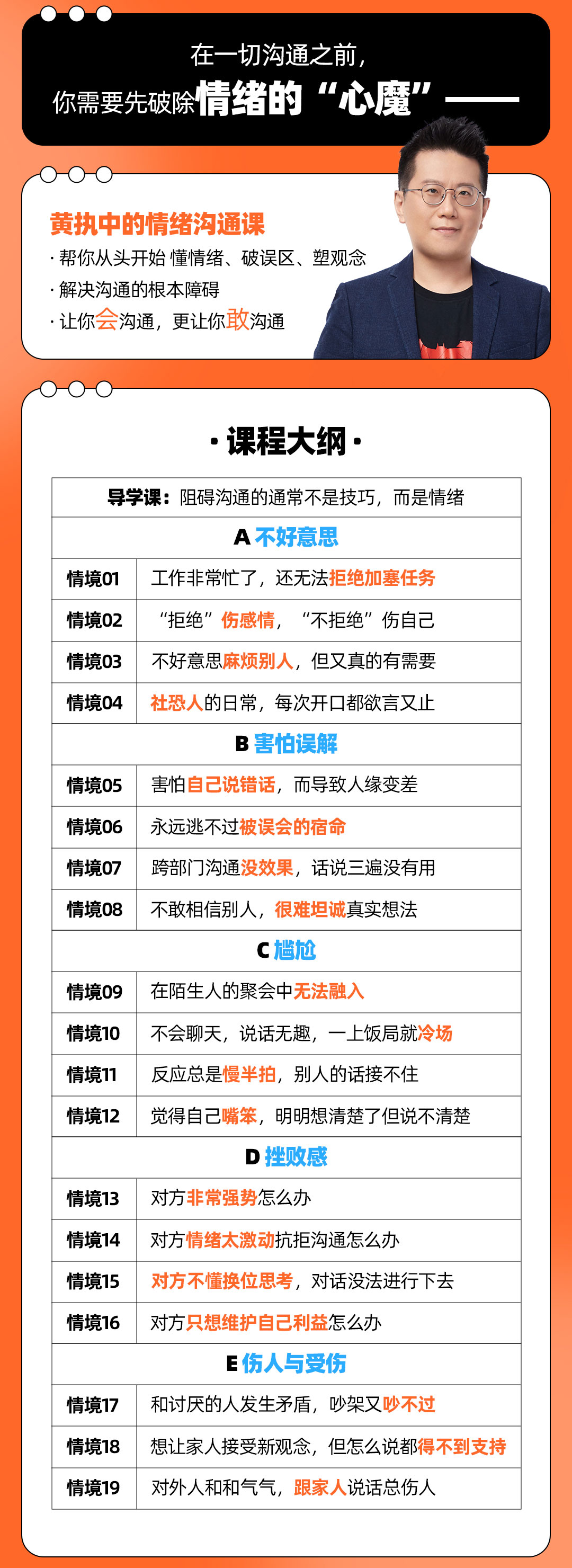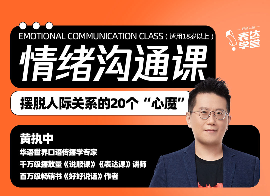 著名口语传播讲师、奇葩说明星辩手黄执中老师通过20节视频课程,带您掌握一套完整的情绪解决方案,重塑正确的沟通观念。结合30+真实案例,让你实际场景中运用自如。