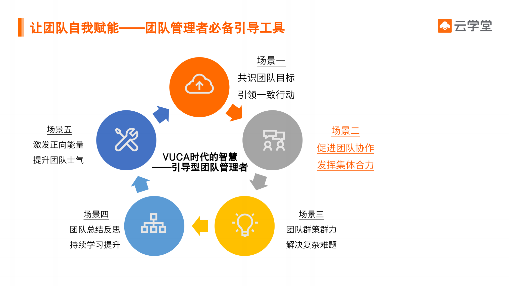 「五大典型场景」五个最常见的团队管理场景,引导技术在不同场景的应用方式 「十二个引导工具」适用于不同场景的典型引导工具,易学、易用、易见效 「丰富的案例与练习」与工具紧密结合的案例与练习,拿来就用,一学就会 云学堂首席引导师 清华MBA 国际引导者协会(IAF)认证专业引导师(CPF) 国际行动学习协会(WIAL)认证行动学习教练(CALC) 前华夏幸福基业培训总监 前北大纵横管理咨询公司资深顾问