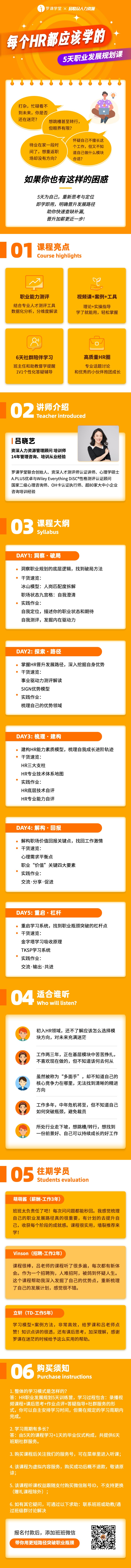 1.洞察职业规划的底层逻辑,找到破局方法 2.掌握HR晋升发展路径,升入挖掘自身优势 3.建构HR能力素质模型,梳理自我成长进阶轨迹 4.解构职场价值回报关键点,找回工作激情 5.重启学习系统,找到职业瓶颈突破的杠杆点