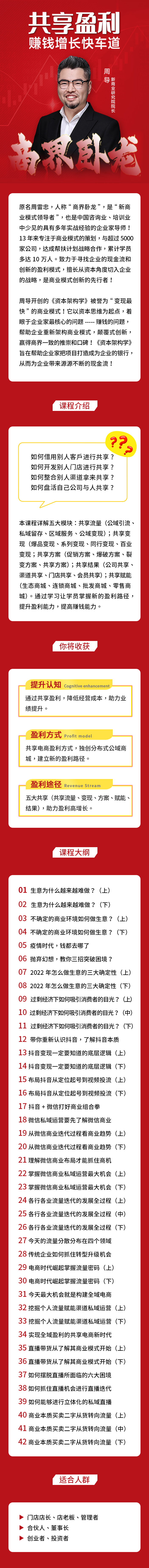 本课程详解五大模块:共享流量(公域引流、私域留存、区域服务、公域变现);共享变现(爆品变现、系列变现、同行变现、百业变现;共享方案(促销方案、爆破方案、裂变方案、共享方案);共享结果(公司共享、渠道共享、门店共享、会员共享);共享赋能(生态商城、连锁商城、批发商城、零售商城)。通过学习让学员掌握新的盈利路径,提升盈利能力,提高赚钱能力。