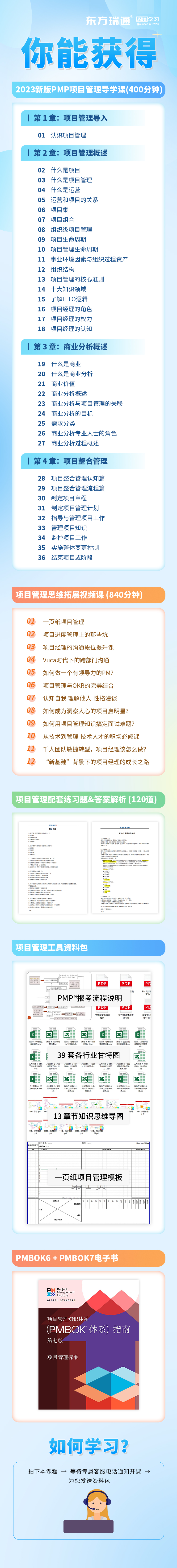 ✅2023年PMP项目管理导学视频课 ✅12节项目管理思维拓展视频课 ✅120道项目管理配套练习题及答案解析 ✅项目管理工具模板包 ✅《PMBOK6》+《PMBOK7》电子书