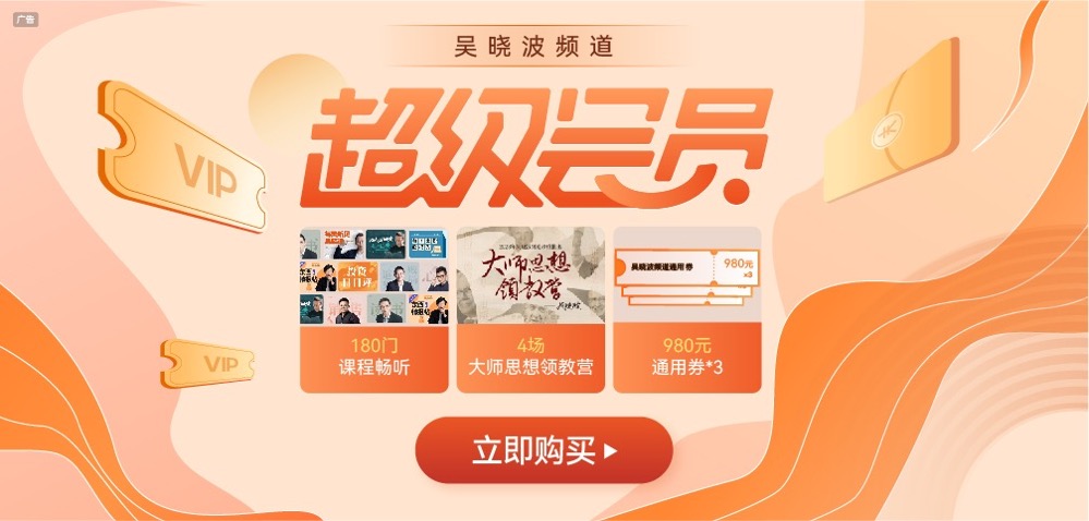 包含“吴晓波频道”APP180+门课程,全年10场大师思想领教营(一年)