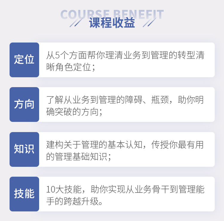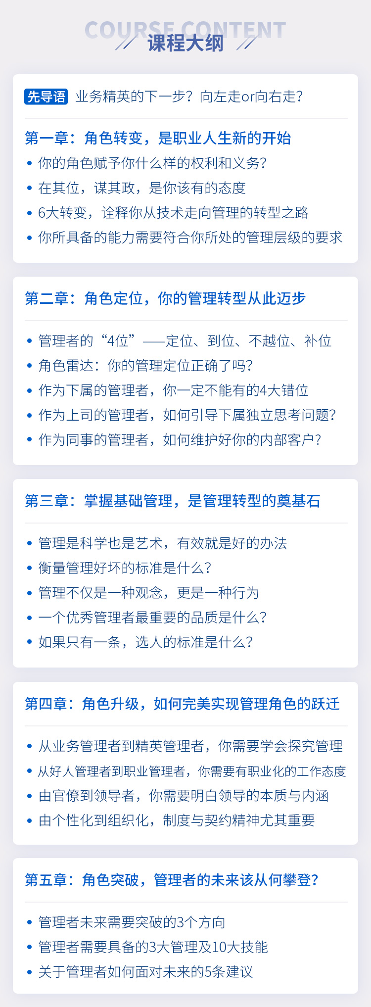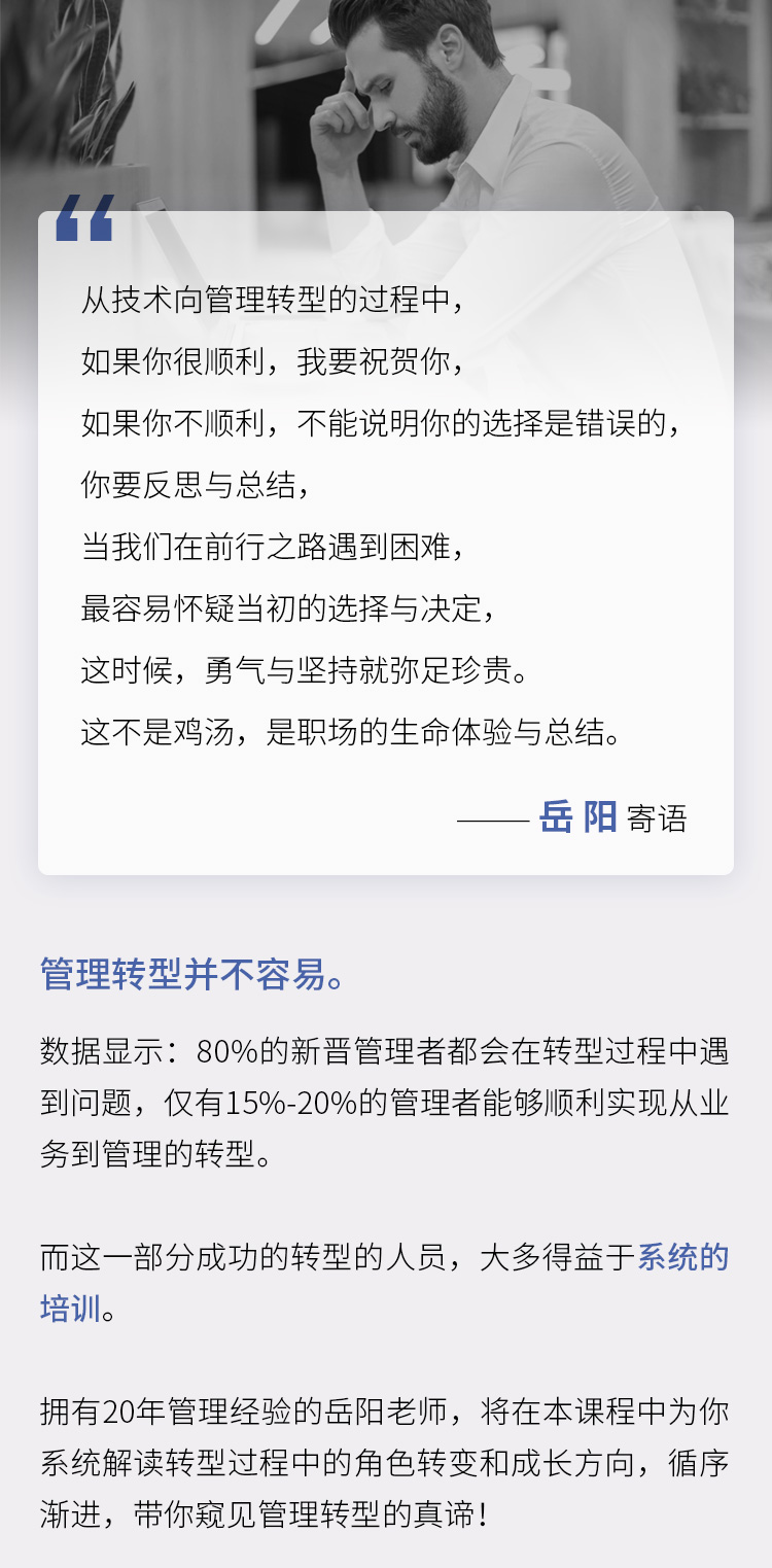 拥有20年管理经验的岳阳老师,将在本课程中为你系统解读转型过程中的角色转变和成长方向,循序渐进,带你窥见管理转型的真谛!