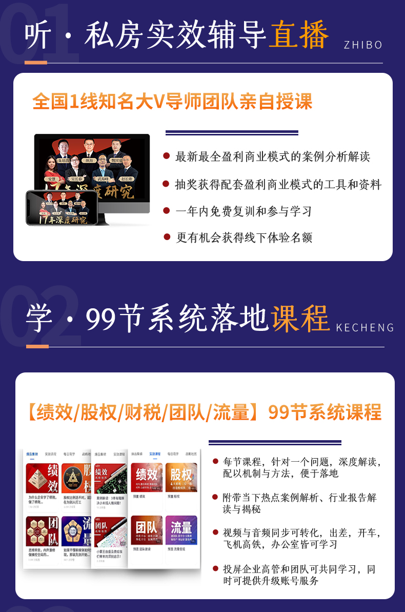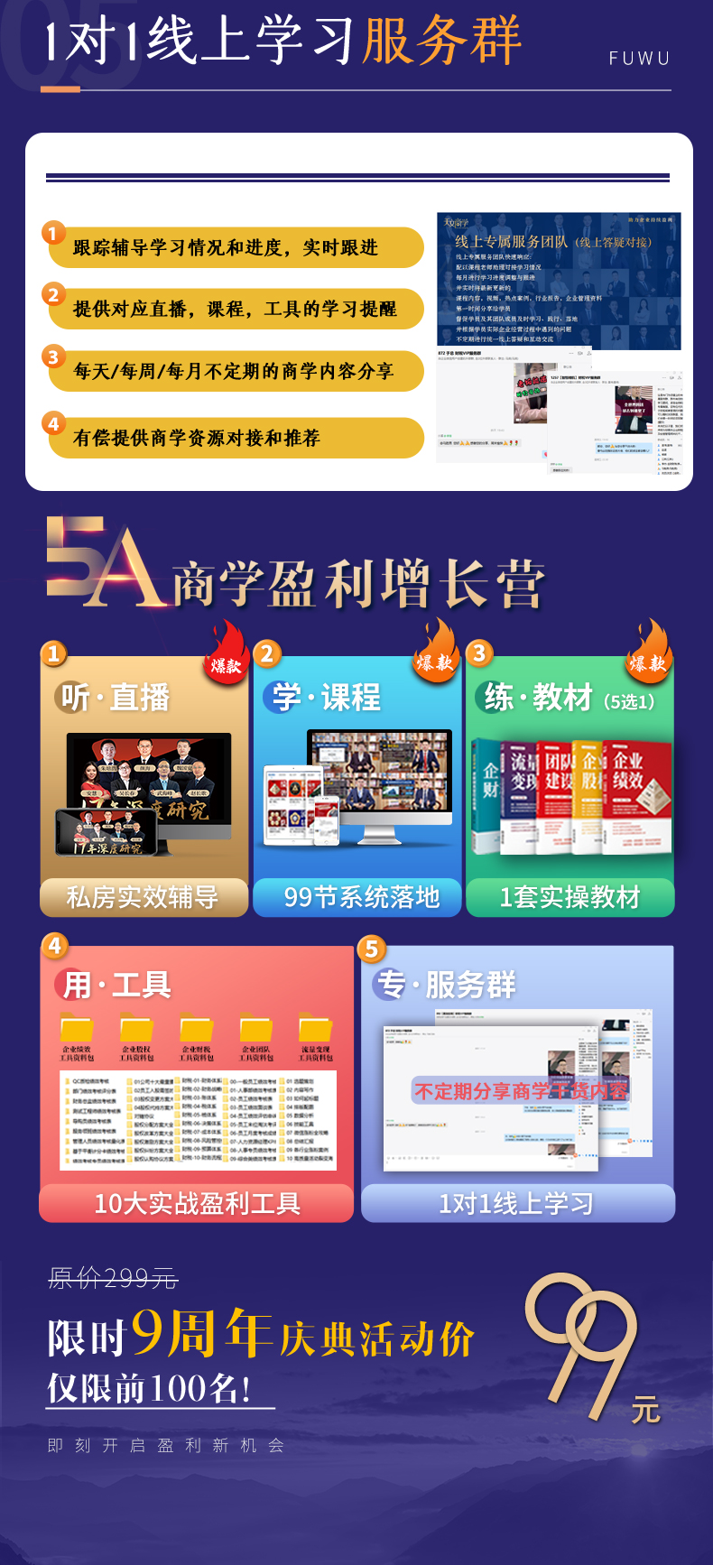 5大超级福利+24小项权益 听·1场私房实效辅导直播 学·99节系统落地课程 练·1套实操绝密教材 用·10大实战盈利工具 专·1对1线上学习服务群