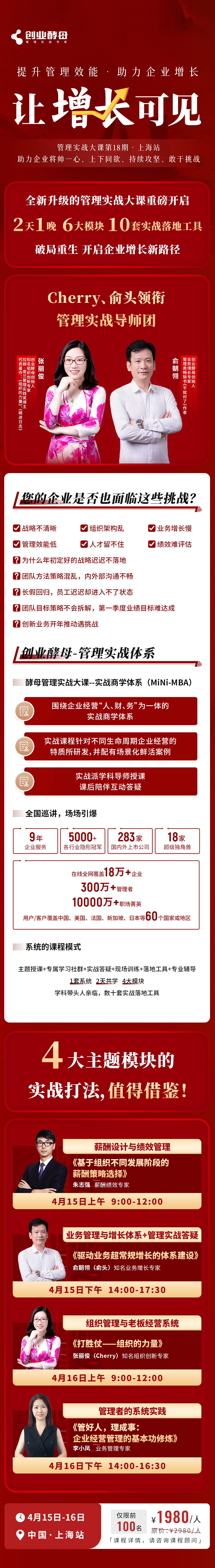 课程内容: 4月15日上午 9:00-12:00《基于组织不同发展阶段的薪酬策略迭择》 4月15日下午 14:00-17:30《驱区动业务超常规增长的体系建设》 4月16日上午 9:00-12:00《打胜仗——组织的力量》 4月16日下午 14:00-16:30《管好人,理成事:企业经营管理的基本功修炼》