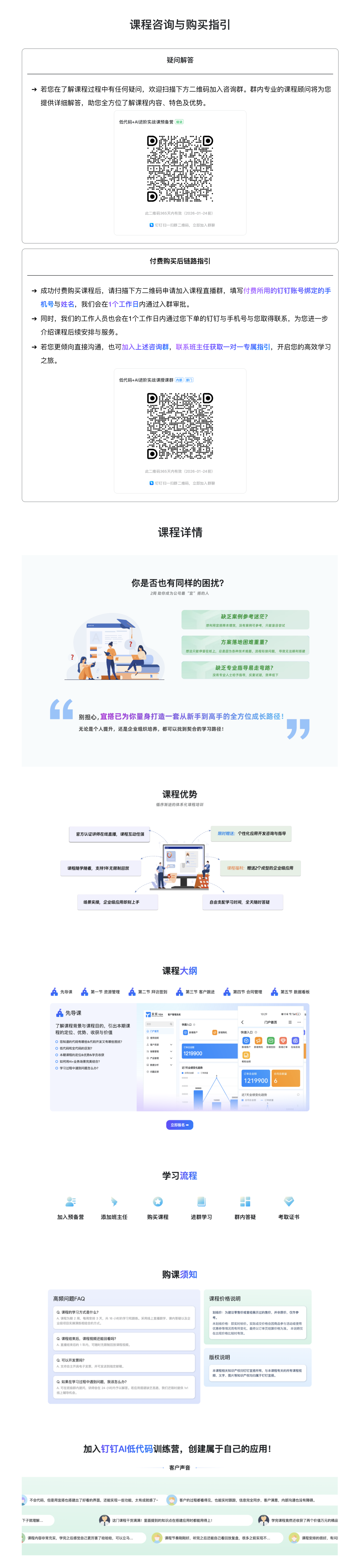 课程概述:10节实战课程,手把手教你搭建企业级应用,重点功能全覆盖,Al能力全掌握。 适用对象:希望把业务想法落地的企业与个人 课程形式:直播+录播留存,随时回顾 配套资源:钉钉官方授课、群内实时答疑、全套学习资料