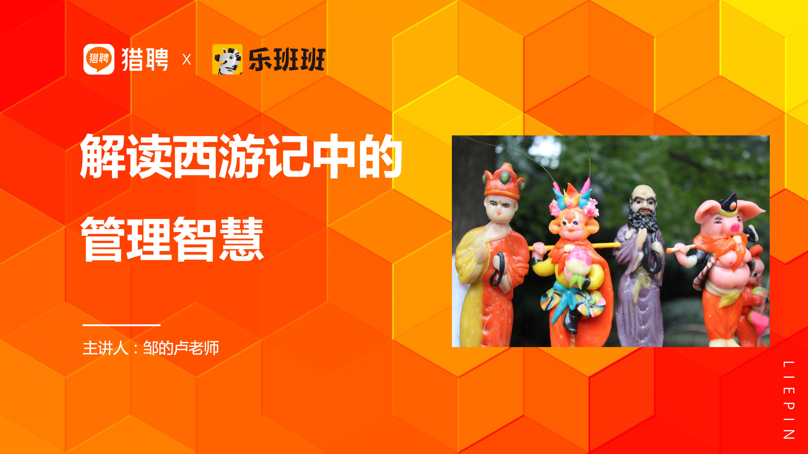 《解读西游记中的管理智慧》,共1课时,65分钟,适用于企业中高层管理,本课程的五大管理启示: 1. 学唐僧的执着:不达目的不罢休;2.懂得“悟空”:空则通,通则灵; 3. 努力做到“八戒”:戒欺、戒贪、戒骄、戒燥、戒懒、戒独、戒粗、戒满; 4. 学沙僧的“傻”:任劳任怨、脚踏实地; 5. 学习小白龙的服务精神:为别人服务的同时也在享受别人的服务。