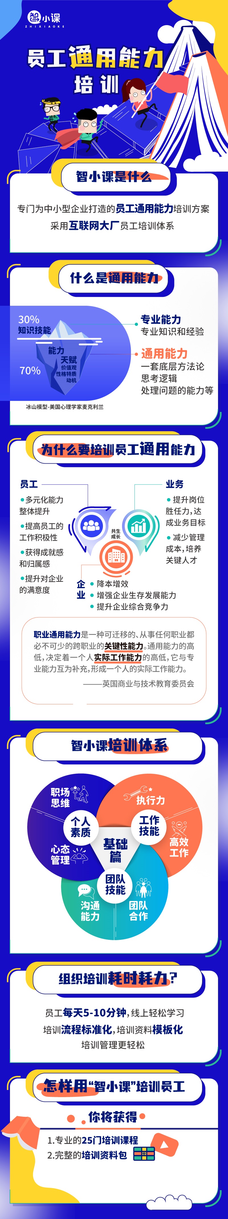 智小课员工通用能力培训介绍 我们凭借十多年为客户定制开发在线课程的丰富经验,为职龄0-5年的员工量身定做符合其需求的通能能力培训课程——智小课。智小课专门为中小型企业打造的员工通用能力培训方案,采用互联网大厂员工培训体系。 课程体系分三个模块六项技能,总计25门课程。课程设计,采用高频工作场景再现+落地的解决方法论和工具,使课程容易吸收、容易落地。 如何学习?每门课5分钟,线上随时随地轻松学。 智小课,领跑职场 成就未来!心动 就行动!