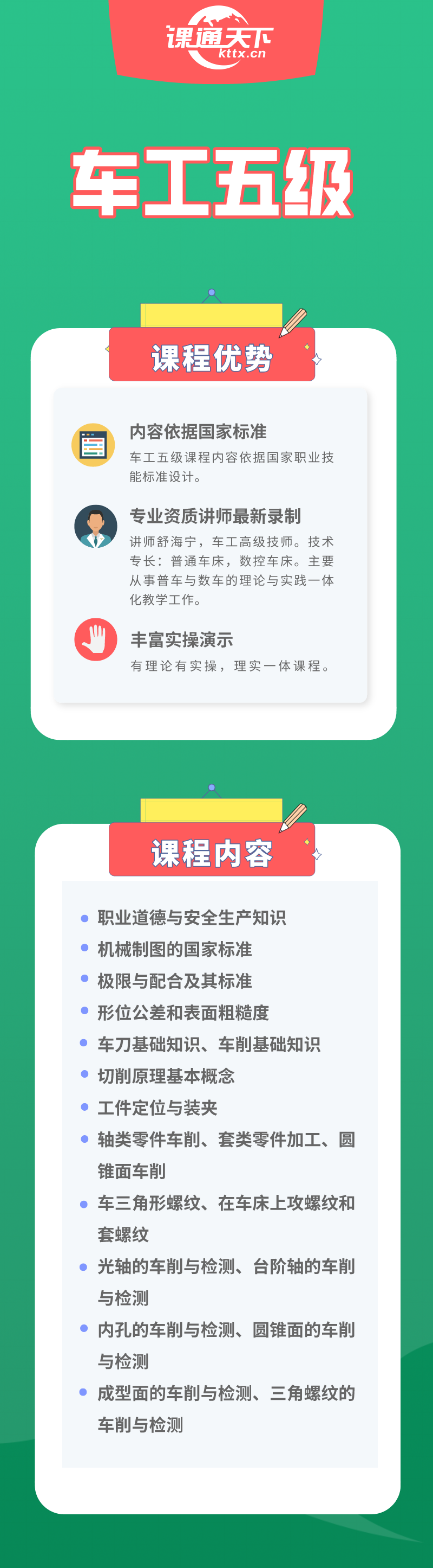本课程面向企业生产一线,培养熟悉企业岗位的工作流程,能按照作业规范熟练操作普通车床,完成中等复杂程度零件的加工与质量检测、设备的日常保养与维护等工作任务,具有良好的责任心和质量意识,具有职业生涯发展基础的技能人才。 课程共计41课时,课程优势及课程内容如下: