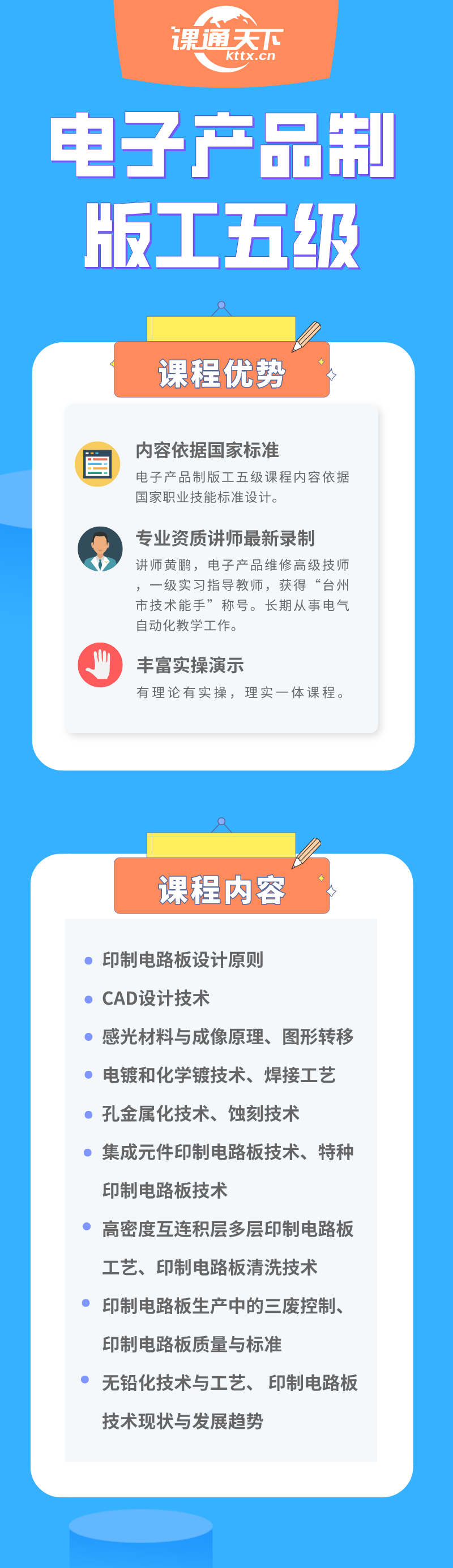 本课程共计40课时,主要内容包括印制电路板设计原则、CAD设计技术、感光材料与成像原理、图形转移、电镀和化学镀技术、焊接工艺、孔金属化技术、蚀刻技术、集成元件印制电路板技术、特种印制电路板技术、高密度互连积层多层印制电路板工艺、印制电路板清洗技术、 印制电路板生产中的三废控制、印制电路板质量与标准、无铅化技术与工艺、 印制电路板技术现状与发展趋势等。
