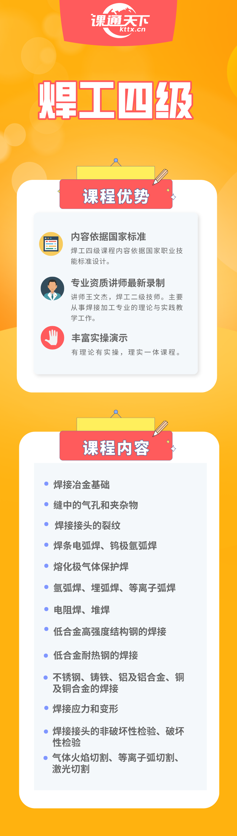 焊工四级课程共计79课时,通过本课程的培训,学习者可以了解并掌握焊工的工作内容及其工作要求,学习此工种在实际中的应用,学会其基本的操作流程。具体如下:焊接冶金基础、焊条电弧焊、焊接接头的裂纹、等离子弧焊、熔化极气体保护焊、堆焊、电阻焊、焊接性、铜及铜合金的焊接、铸铁的焊接、铝及铝合金的焊接、不锈钢的焊接、低合金耐热钢的焊接、低合金高强度结构钢的焊接、力和变形的特点与分类、焊接应力和变形的产生原因、低合金高强度结构钢的焊接等知识点,完全符合国家技能培训大纲要求。