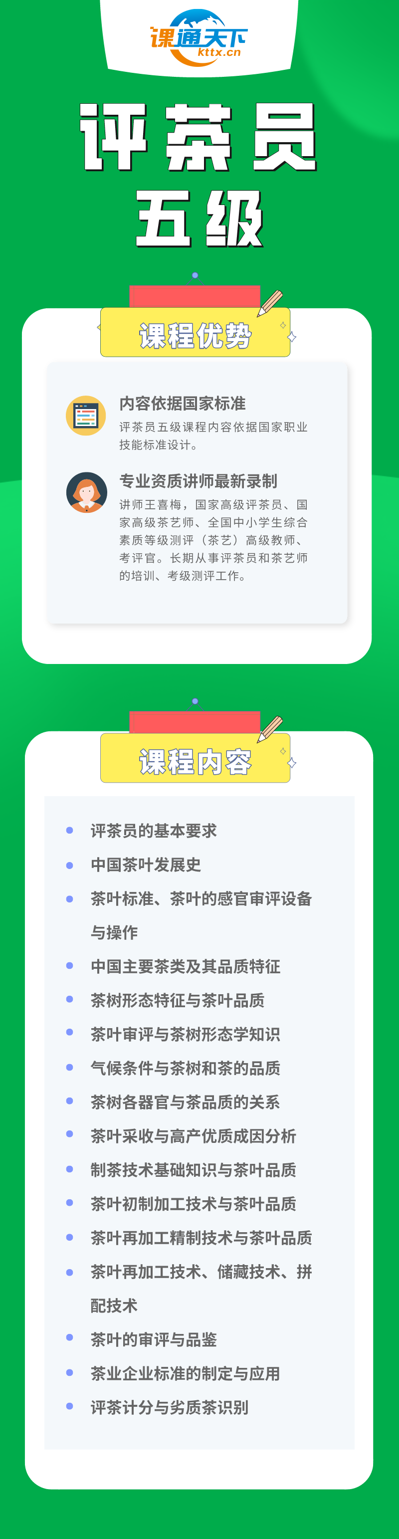 本课程共计42课时,通过本课程的培训,秉着知其然还要知其所以然的培训理念,学习者不仅可以学习到丰富的理论知识,还能运用评茶技术审评茶叶,更好地识别茶叶的好坏、等级,有效提高茶企、茶商的茶产品质量,同时进行有效的市场定价,促进茶厂、茶企、茶商实现有效的市场竞争,从而促进茶产业的良性健康发展。低优次的鉴别,对茶叶评定等级。
