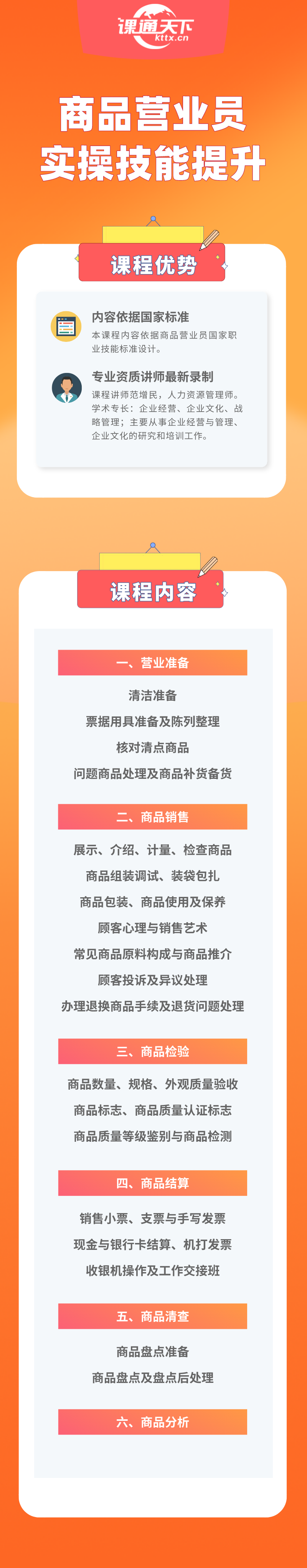 本课程共计21学时,适合店面销售类岗位人员学习,课程内容涵盖此类岗位关键工作场景,并按照工作流程顺序对关键工作场景下的专业知识、操作要求、操作流程和方法等逐一进行讲解,具体包括如下六大关键场景:营业准备、商品销售、商品检验、商品结算、商品清查与商品分析。