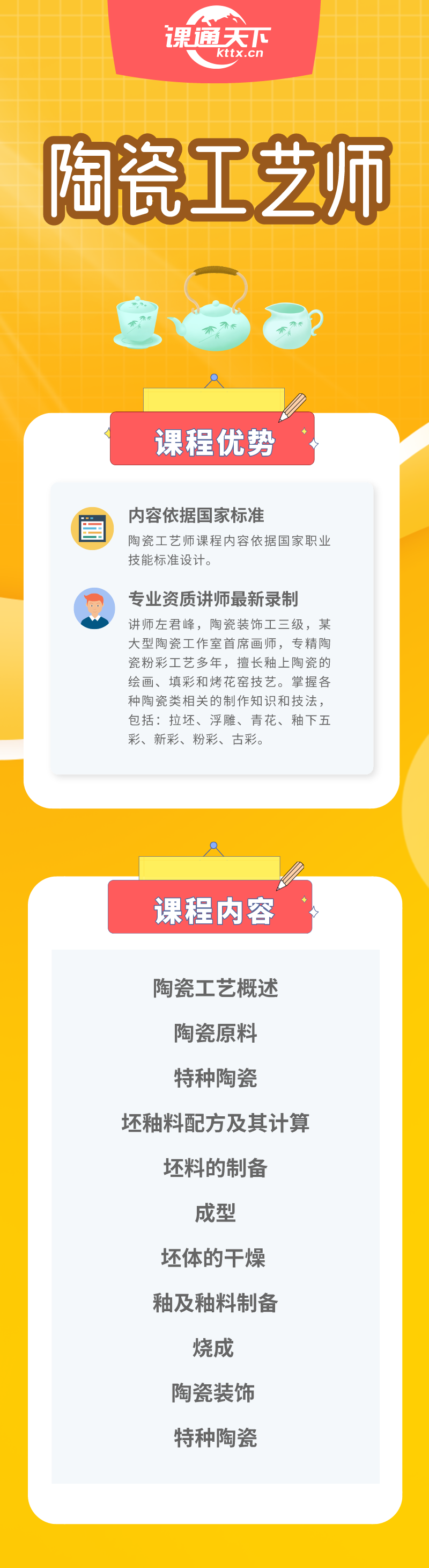 本课程共22学时,适合从事陶瓷工艺技术的相关人员学习,课程主要对陶瓷工艺技术进行了系统介绍,包括陶瓷的原料,坯釉料配方及其计算,坯料的制备、成型,坯体的干燥,釉及釉料制备、烧成,陶瓷装饰等。