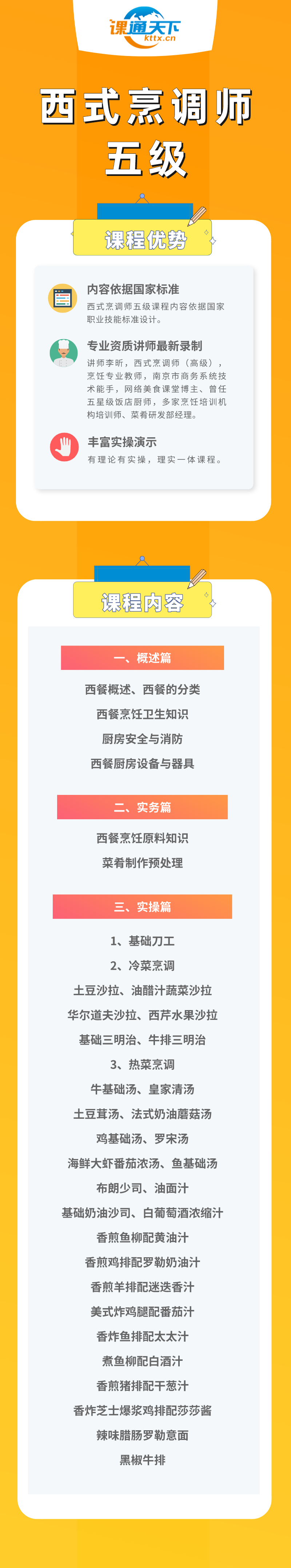 本课程共42学时,适合从事西餐烹调及服务人员学习,课程分为三个部分,其中概述篇对西餐、西餐分类、西餐厨房设备器具、厨房安全与消防等进行了介绍;实务篇介绍了西餐烹饪原料知识以及菜肴制作预处理知识;实操篇介绍并演示了多种西餐冷菜和热菜的烹饪技法。