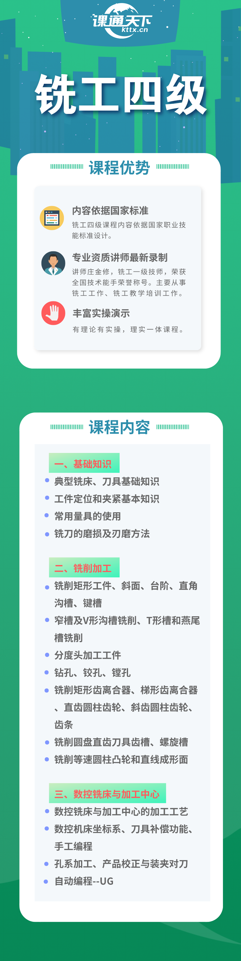 本课程共计41课时,通过本课程的培训,了解普通铣床、数控铣床、加工中心、各种工件面、槽、孔的加工、手动编程、自动编程、UG系统等相关内容。