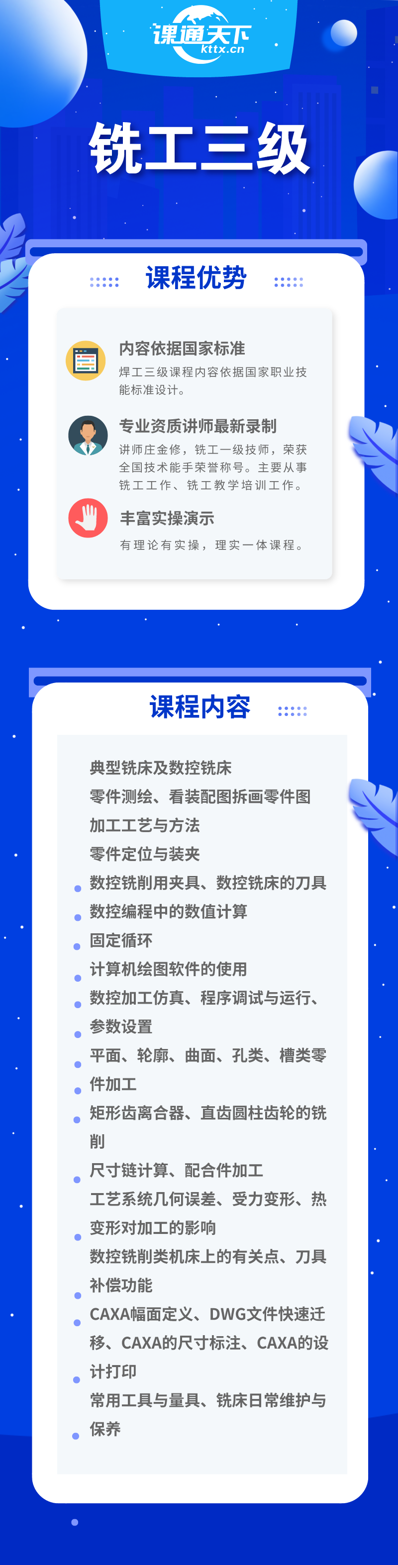 本课程共计41课时,通过本课程的培训,了解普通铣床、数控铣床、加工中心、各种工件面、槽、孔的加工、手动编程、自动编程等相关内容。具体如下: