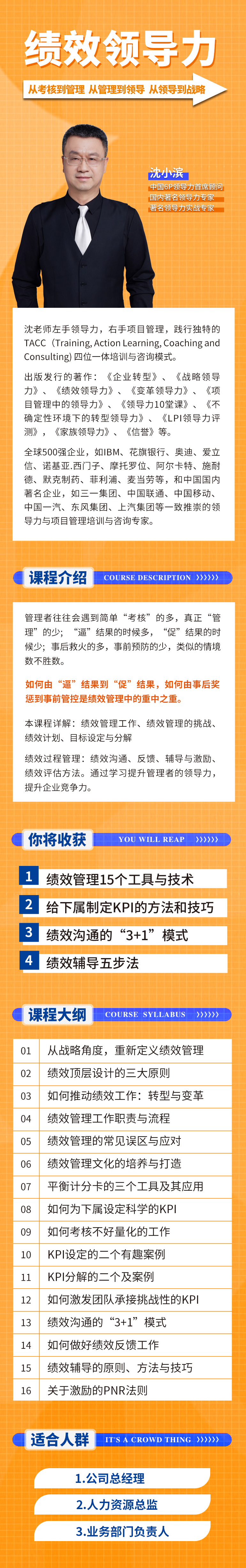 本课程详解:绩效管理工作、绩效管理的挑战、绩效计划:目标设定与分解、绩效过程管理:绩效沟通、反馈、辅导与激励、绩效评估方法。通过学习提升管理者的领导力,提升企业竞争力。