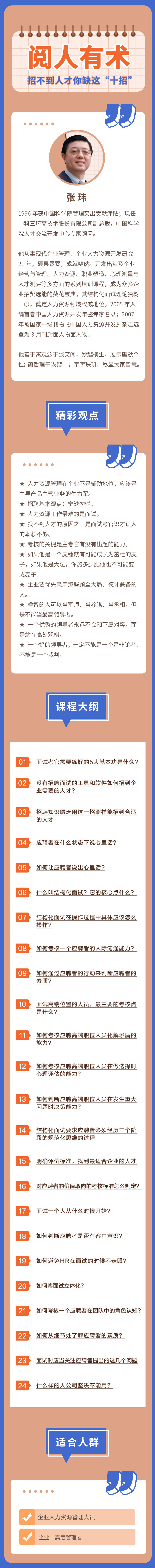 课程通过面试问题的设计+具体案例的分析,详细介绍招聘面试十招的方法和技巧,从而提升人力资源、管理者识人用人的能力,让你的企业轻松招到最合适的人才,提升企业的竞争力。