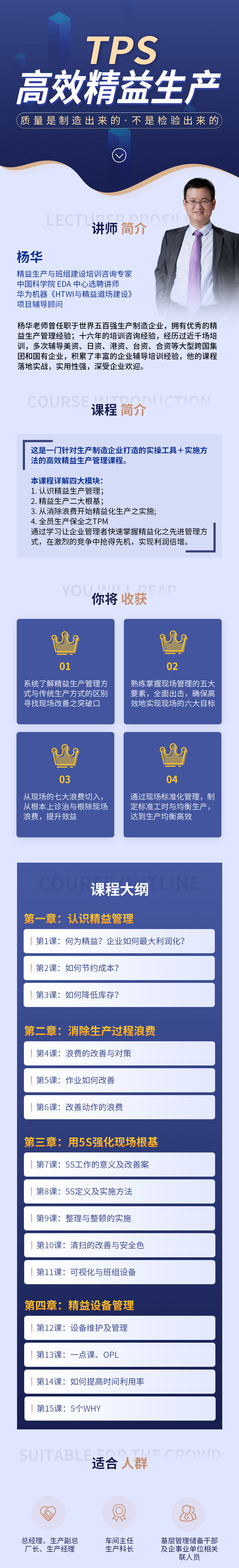 本课程详解四大模块:认识精益生产管理;精益生产二大根基;从消除浪费开始精益化生产之实施;全员生产保全之TPM,通过学习让企业管理者快速掌握精益化之先进管理方式,在激烈的竞争中抢得先机,实现利润倍增。