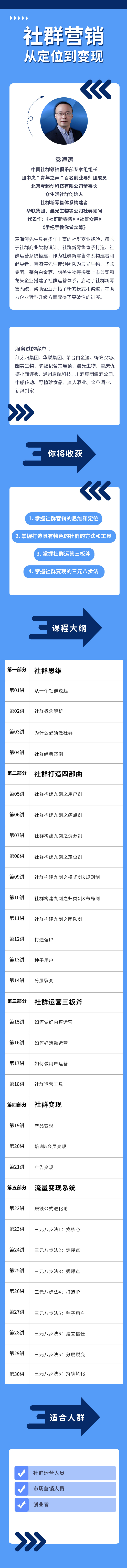 本课程详解讲解社群思维、社群打造四部曲、社群运营三板斧、社群变现、流量变现系统5个部分,从社群的建立到变现,帮助企业开拓了新的模式和渠道,助力企业转型。