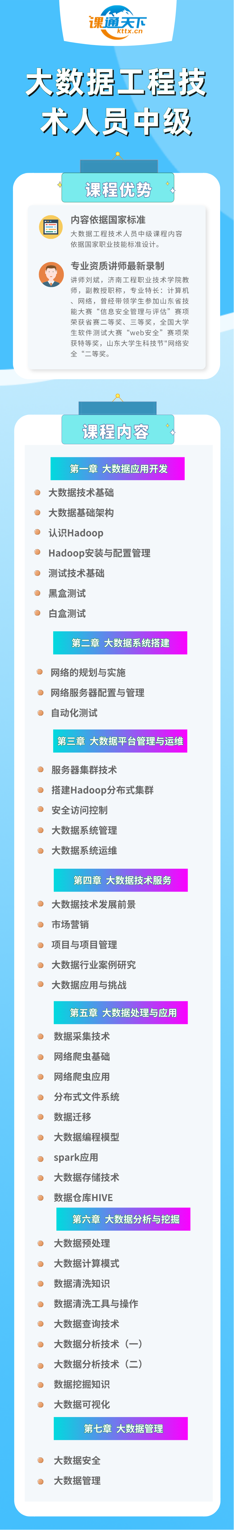 本课程共计40课时,通过本课程的培训,学习者可以了解并掌握大数据工程技术人员(中级)的技能要求和相关知识。
