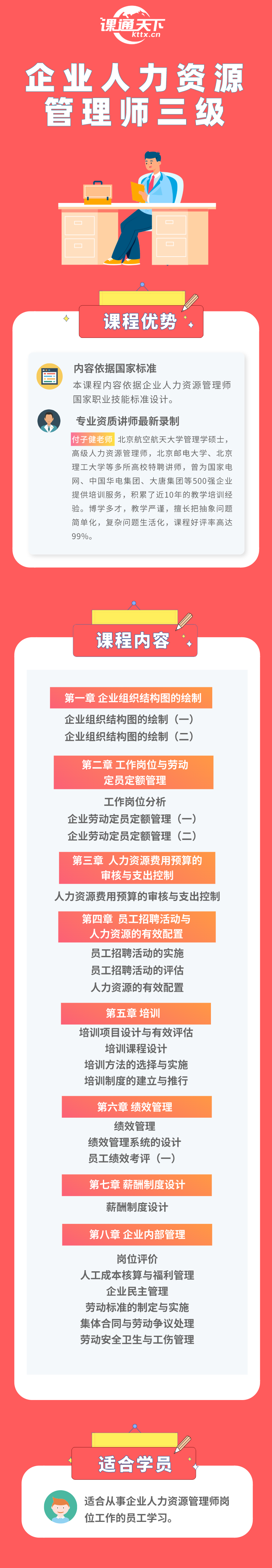 本课程适合从事企业人力资源管理师的人员学习,主要学习内容包括:企业组织结构图的绘制、工作岗位与劳动定员定额管理、人力资源费用预算的审核与支出控制、员工招聘活动与人力资源的有效配置、培训、绩效管理、薪酬制度设计、企业内部管理等内容。