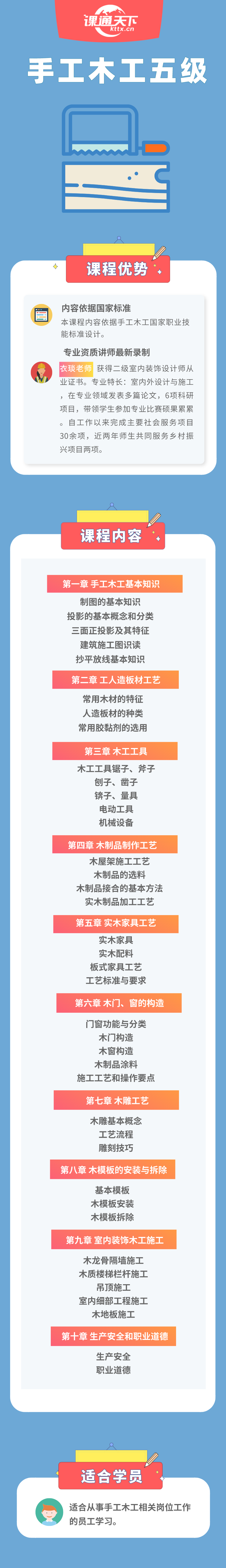 本课程共39学时,适合从事手工木工的人员学习,主要学习内容包括:手工木工基本知识、人造板材工艺、木工工具、木制品制作工艺、实木家具工艺、木门和窗的构造、木雕工艺、室内装饰木工施工、生产安全和职业道德。