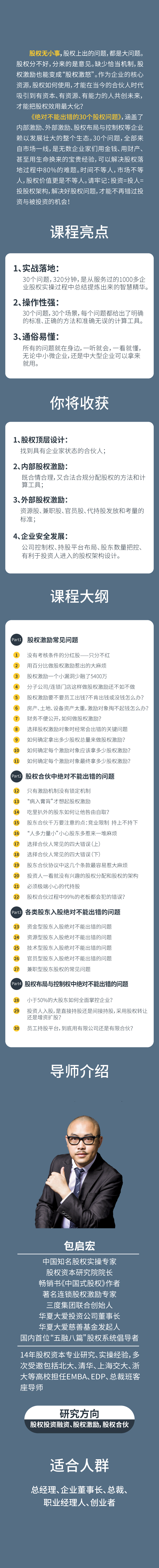 1、股权顶层设计:找到具有企业家状态的合伙人; 2、内部股权激励:既合情合理,又合法合规分配股权的方法和计算工具; 3、外部股权激励:资源股、兼职股、官员股、代持股发放和考量的标准; 4、企业安全发展:公司控制权、持股平台布局、股东数量把控、有利于投资人进入的股权架构设计。