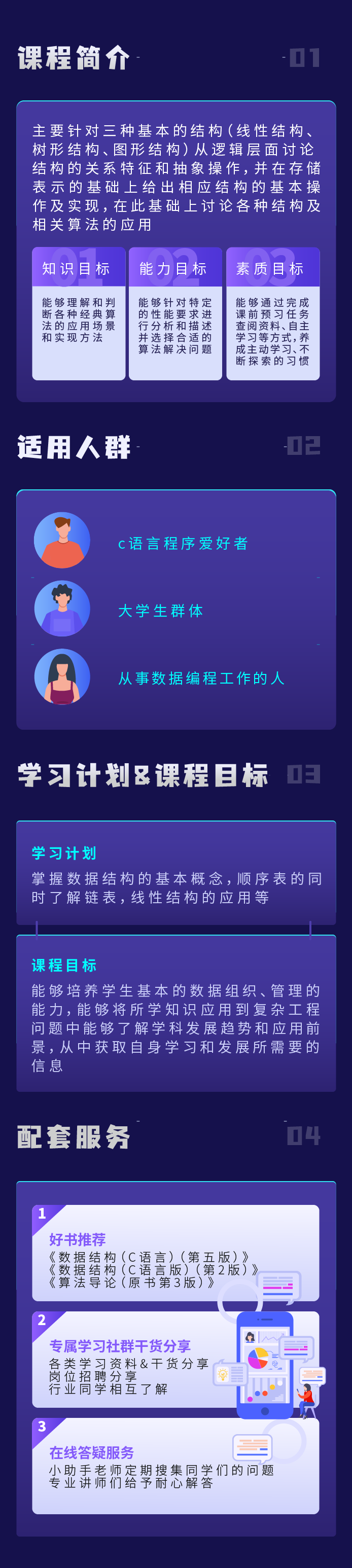 本课程是一门关于非数值数据在计算机中表示、变换及处理的课程。主要针对三种基本的结构(线性结构、树形结构、图形结构),从逻辑层面讨论结构的关系特征和抽象操作,并在存储表示的基础上给出相应结构的基本操作及实现,在此基础上讨论各种结构及相关算法的应用。